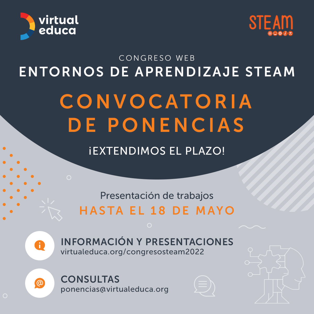 El comité organizador del Congreso Web: ‘Entornos de aprendizaje STEAM’, que se realizará el 26 y 27 de mayo de 2022 anunció la extensión del Call for Papers hasta el 18 de mayo.