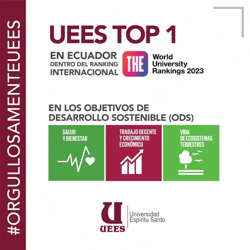 La Universidad Espíritu Santo (UEES) obtuvo una destacada posición en el reciente THE Impact Ranking 2023, publicado por Times Higher Education. La institución de Educación Superior ecuatoriana se ubicó como la número uno a nivel nacional en los ODS 3, 8 y 15, relacionados a la Salud y Bienestar, Crecimiento Económico y empleo; y preservación de la Vida de ecosistemas terrestres respectivamente.