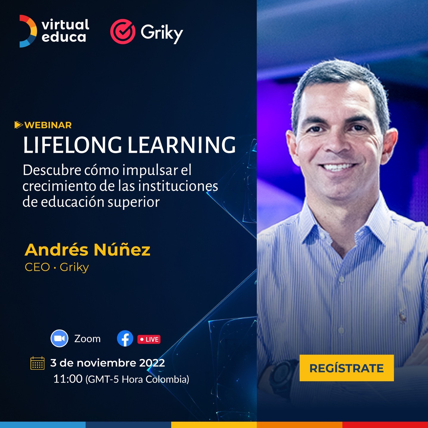 El webinar estará a cargo de Andrés Núñez, experto en Educación Digital con más de 30 años de experiencia, quien además es el CEO y fundador de Griky, la red de aprendizaje permanente más grande de Iberoamérica que ya ha impactado a más de 350 mil estudiantes a través de más de 40 universidades y empresas aliadas, con soluciones de aprendizaje ilimitado, flexible y pertinente.