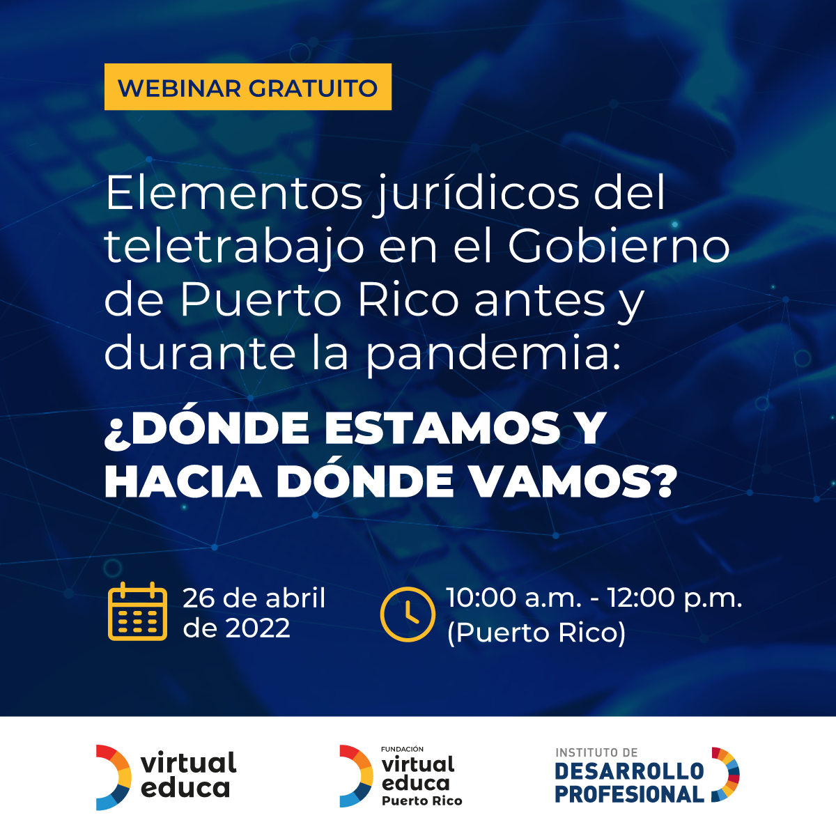 La Fundación Virtual Educa Puerto Rico, por medio del Instituto de Desarrollo Profesional (IDP), invita a participar del próximo webinar que organiza a través de la plataforma Zoom, completamente libre de costos, y que tendrá lugar el martes 26 de abril, de 10 a 12 (hora de Puerto Rico, GMT-4).